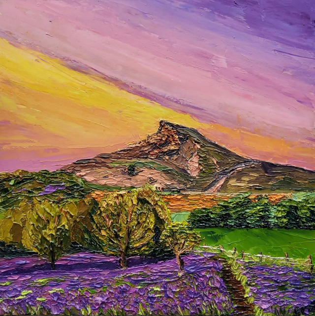 Bring the beauty of a sunset over Roseberry Topping and Bluebell woods into your home with this original oil painting on a 6x6 wooden canvas. Capturing warm pinks and oranges in stunning detail, this textured art piece was created using a palette knife for a unique finish. Perfect for adding a touch of nature to any room, this painting is a one-of-a-kind masterpiece that will surely be a focal point in your décor. Display it on its own or as part of a gallery wall to showcase your love for nature and fine art.